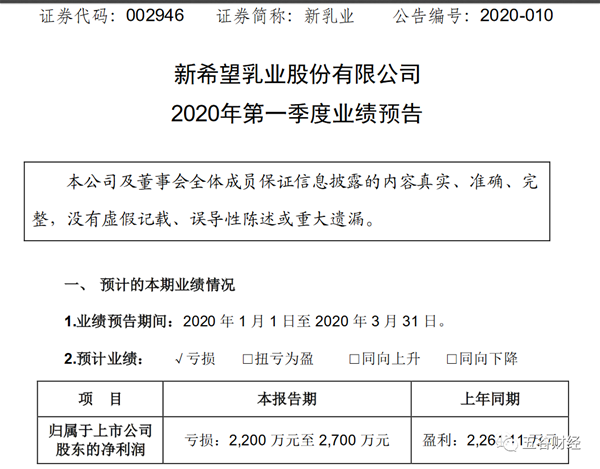 4月15日午間,新乳業(全稱“新希望乳業股份有限公司”)公開了2020年第一季度業績預告,受新冠疫情影響,新乳業經營和對聯營公司的投資收益受到負面沖擊,...