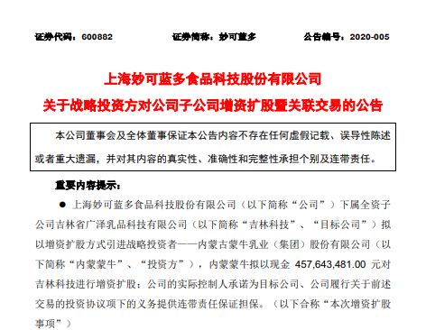 2020年國內(nèi)第一宗食品巨頭收購案,主角仍是去年連番買買買的蒙牛! 剛剛,在上交所上市的上海妙可藍(lán)多食品科技股份有限公司(簡稱“妙可藍(lán)多股份”)發(fā)布公...