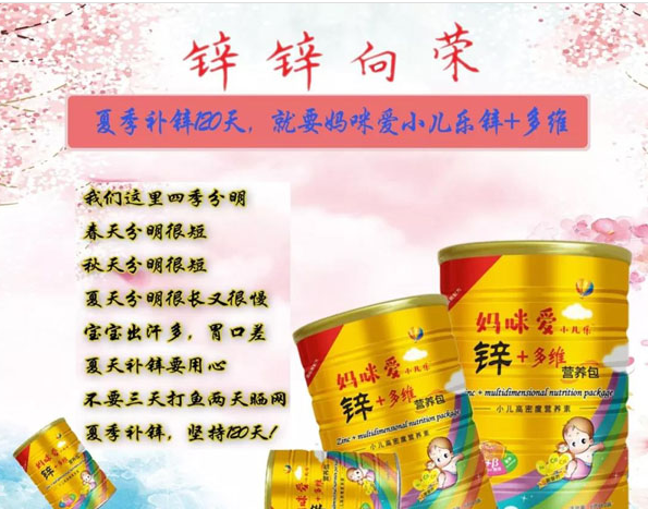 產品賣點: 媽咪愛小兒樂鋅+多維營養(yǎng)包,富含多種維生素有效提高鋅吸收, 糾正微量元素缺乏或失衡,特別添加進口水果粉并且對孩子嬌嫩的腸胃沒有刺激,安全口感好,孩子容易接受,如堅持服用可以有效緩解缺鋅癥狀。 2. 缺鋅癥狀較輕,日常食療補充:寶寶缺鋅的癥狀較輕,可以靠日常飲食調理。據(jù)調查,動物性食物含鋅量遠高于植物性食物,且鋅的吸收率也高。其中,牡蠣、鯡魚鋅含量最高。建議家長多給孩子吃瘦肉、豬肝、魚等動物性食物,這類食物鋅含量高。如果寶寶采用人工喂養(yǎng),從出生后4個月起,家長應特別注意添加富含鋅元素較多的輔食,幫助寶寶吸收鋅元素,如:瘦肉末、蛋黃、魚泥、核桃仁粉等。 媽咪愛小兒樂與你開心過盛夏! 理智補鋅,貴在堅持,夏季是寶寶缺鋅的高發(fā)季節(jié),補鋅一定要堅持120天! “春生夏長”從來都是不變的道理,媽媽們一定要抓住孩子補鋅的黃金季節(jié)——夏季,為孩子科學的補充鋅元素,讓孩子擁有一個受益無窮的成長季。 |