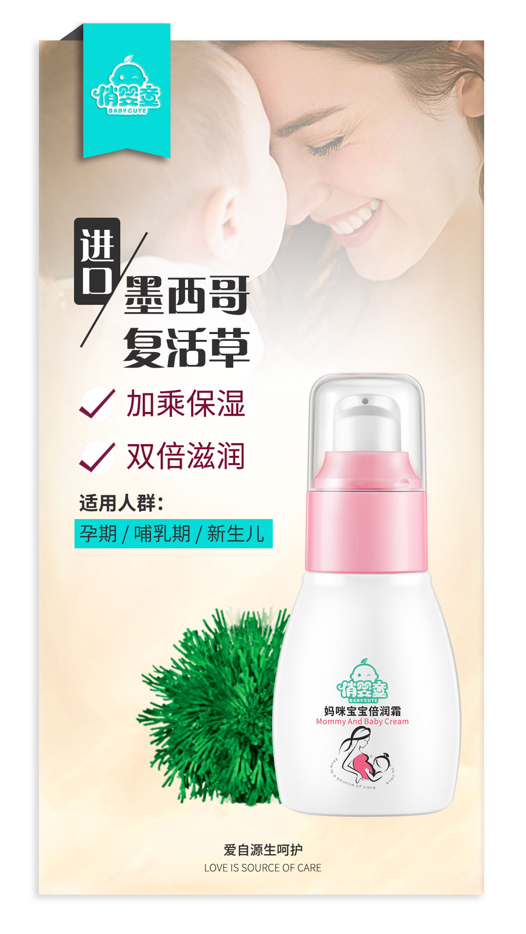 俏嬰童媽咪寶寶倍潤霜優質自然原材,天然植物成分,以益生元(生態營養液)、有機燕麥β- 葡聚糖、日本野大豆胚芽提取物、墨西哥復活草提取物、菊粉、甘油等護膚成分為核心,0%香精無香配方可以放心的給寶寶使用,也可以讓寶寶接觸更多的媽媽味道。同時,俏嬰童媽咪寶寶倍潤霜有機保濕修復干裂不泛紅,舒緩敏感防皴面部專用。
