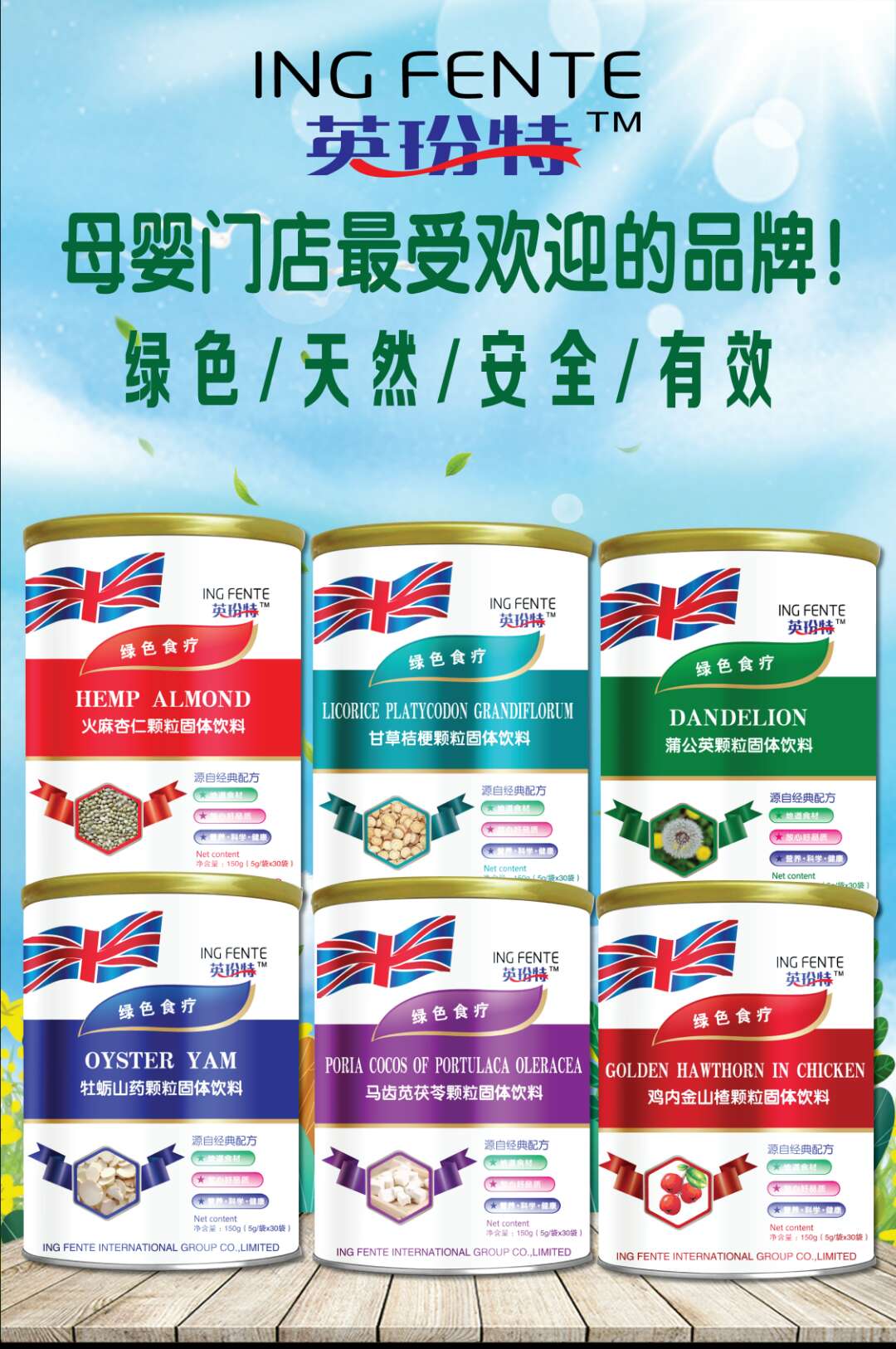 英玢特藥食同源固體飲料系列產品精選多種藥食同源植物為主要原料,綠色安全,品質保證,以中醫理論為基礎,科學萃取其精華成分,經嚴格工藝精制而成,安全營養,綠色守護,關愛成長健康!每罐單品凈含量150克(5克/袋X30袋)。 “英玢特--ING FENTE INTERNATIONAL GROUP CO.,LIMITED ”位于英國倫敦市,是一家專業致力于投身母嬰營養領域,研究,生產,銷售,服務為一條龍的新型醫藥科技型企業,更多詳細信息請咨詢公司招商專題。