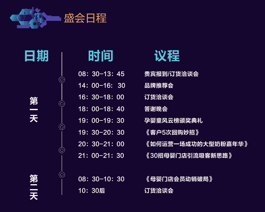 盛會看點 訂貨洽談——眾多知名廠家品牌展示,讓您零距離找到優質好產品 聽課學習——聆聽5大課程,提升經營方法,解 決經營難題 行業交流——500多家母嬰同行精英齊聚,交心交朋友營造圈子 風云榜單——揭曉2018-2019年度風云榜單,定位發展方向 盛會特邀嘉賓