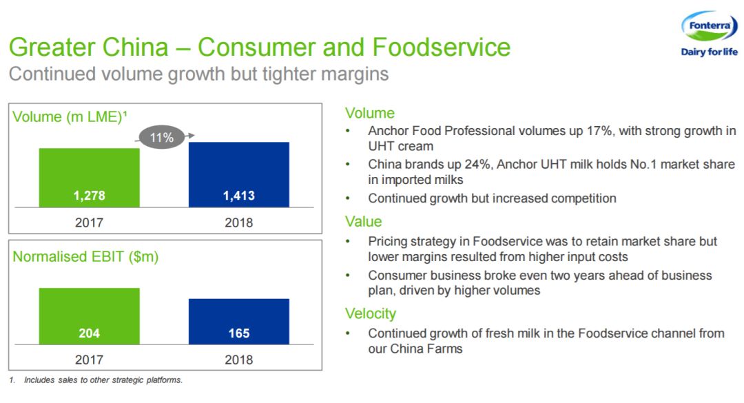 2018財年,恒天然大中華區(qū)消費品牌和餐飲服務(wù)的銷售同比增長了11%,由相當(dāng)于12.78億升等量液態(tài)奶,增長至相當(dāng)于14.13億升等量液態(tài)奶。 具體而言,在消費品牌業(yè)務(wù)上,2018財年,恒天然大中華區(qū)的銷量同比增長24%,由上一財年的相當(dāng)于1.12億升等量液態(tài)奶,增長至相當(dāng)于1.39億升等量液態(tài)奶。