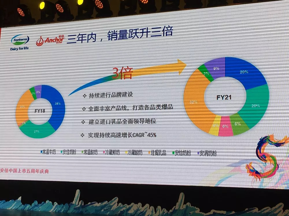 另外,恒天然在演示材料中提到,在餐飲服務(wù)渠道,由該公司中國牧場供應(yīng)的鮮奶也呈持續(xù)增長。 就在上周,安佳還提出了在中國要實現(xiàn)“三年銷售翻三倍”的新目標(biāo),復(fù)合年增長率(CAGR)達(dá)到約45%。該品牌表示,接下來將全面豐富產(chǎn)品線,“打造各品類爆品,建立進(jìn)口乳品全面領(lǐng)導(dǎo)地位”。 恒天然大中華區(qū)總裁朱曉靜認(rèn)為,安佳消費品在中國市場的良好表現(xiàn),也充分印證了恒天然在中國戰(zhàn)略方向的正確。