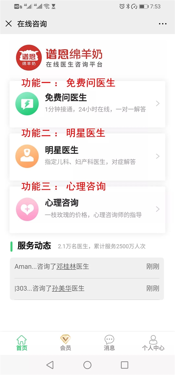 兩大主要功能:免費問醫生和明星醫生 免費問診方式: Step1:關注“譜恩綿羊媽媽”微信公眾號,點擊菜單欄“在線醫生”