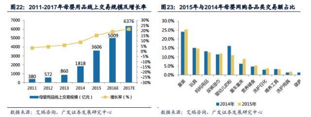 根據(jù)艾瑞咨詢的數(shù)據(jù),2011年至2015年線上母嬰消費(fèi)規(guī)模加速增長,迅速擴(kuò)大。 2015年規(guī)模已達(dá)到3606億,增長率達(dá)到15.5%,預(yù)計(jì)到2017年我國線上母嬰消費(fèi)將達(dá)到6376億元規(guī)模。而在線上母嬰消費(fèi)各品類中,童裝所占比例最大。2015年母嬰網(wǎng)購交易額中,童裝占比達(dá)到25.4%,比2014年的24.1%增長了一個百分點(diǎn)。
