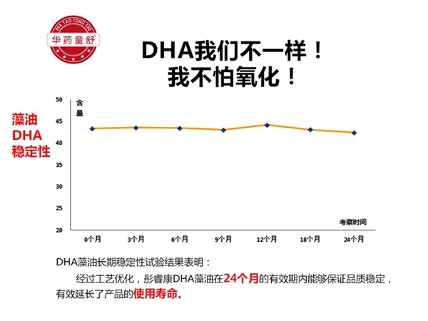 3、強抗氧化,穩定性強:由于DHA分子富含不飽和雙鍵,狀態十分不穩定,受到氧氣、溫度和光線等因素容易被氧化變質。彤睿康DHA工藝優化,穩定性強,品質過硬,給力護成長;