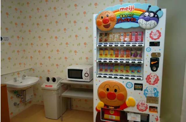 ↑嬰兒室內的自動售貨機,比照幼兒身體設計,就連飲料盒都比一般的小,適合孩子的小手拿握。 ↑嬰兒室允許男性進入給孩子沖奶粉,換尿不濕。而哺乳區內是一個個獨立的哺乳室,男性止步。墻上有應急按鍵。