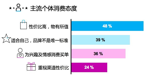 為興趣買單、理性消費(fèi)、重性價(jià)比 成為主流消費(fèi)態(tài)度 為興趣買單、理性消費(fèi)、重性價(jià)比成為主流消費(fèi)態(tài)度。尼爾森數(shù)據(jù)顯示,48%的消費(fèi)者對(duì)未來一年的購(gòu)買傾向?yàn)檫x擇性價(jià)比高、物有所值的產(chǎn)品;39%的消費(fèi)者比較傾向于選擇適合自己的,他們認(rèn)為品牌不是唯一抉擇標(biāo)準(zhǔn);有36%的消費(fèi)者愿意為興趣及情感消費(fèi)買單,同時(shí)24%的消費(fèi)者注重渠道性價(jià)比。