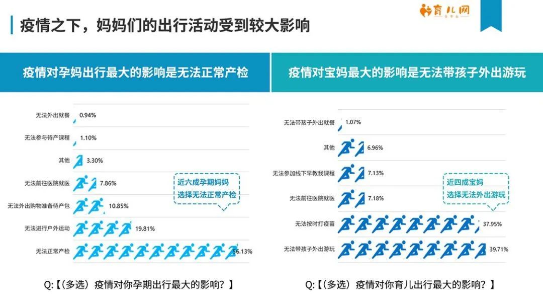 孕媽寶媽生活受影響但情緒平穩 疫情蔓延,病情進展自然是絕大多數人關心的頭條。母嬰人群雖然也不例外,不論是孕媽還是寶媽,疫情關注度均超過75%。不過作為特殊人群,她們對于自身需求的關切度尤為凸顯。 準媽媽們一方面普遍缺乏育兒經驗,而且涉及腹中胎兒的安全,所以“孕期產檢(63.52%)、胎兒發育(47.17%)”成為孕育人群最關心的話題。另外,為嚴防新冠病毒院感情況,全國多個地區的公立醫院除保留發熱門診、急診等必要科室外,其他科室暫時停診,門診部、專科診所等也都全面停診,加上公共交通的傳染危險性較大,準媽媽又是傳染病易感染群,產檢的時間安排受到很大影響,“無法正常產檢”成為56.13%的孕媽出行方面最大的影響。 而已經育有子女的媽媽,自然最關心家庭成員的安全健康,有超過69%的媽媽關注這一問題。有網友說“2003年我害怕,因為我還是個孩子,2020年我害怕,因為我有個孩子”,生動的形容了這種狀態。而出行方面,如何和孩子在家度過一個沒有游樂場博物館旅游區的假期,成了寶媽們的煩心事。