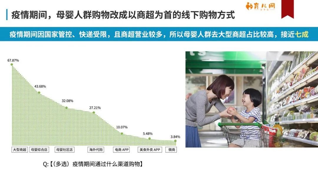 可見,母嬰人群除了和疫情相關的信息,更關心和“母嬰“緊密相關的主題,這一點需要母垂類APP來滿足。作為特需人群,孕媽、寶媽們高度依賴母嬰APP,以尋求對疫情問題、孕育問題的相關解答。 商超受寵:少出門多囤貨,營養品市場大 教育、娛樂線上一派火熱,但購物消費方面線下華麗逆襲。因為國家管控,快遞受限,日常極其方便的網絡購物顯出疲態,貨量足離家近支付快不停業的線下商超成為母嬰人群消費的首要購物方式,67.87%的受訪者選擇大型商超購買商品。畢竟吃喝穿用不能虛擬,物流快遞受限無力,相比線上虛擬購物,商超更加眼見為實,售后也更方便快捷。更何況遠水解不了近渴,帶貨再好也要快遞給力。