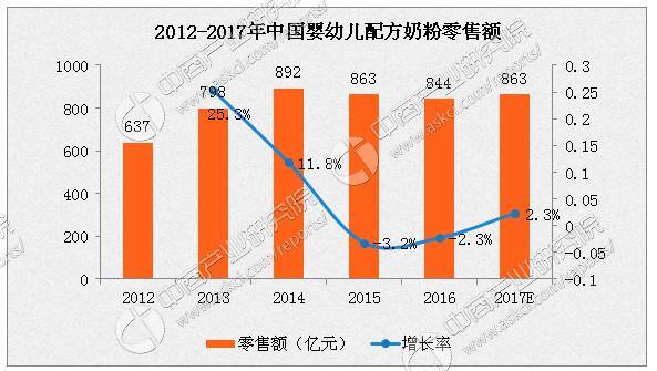 中國嬰幼兒配方奶粉市場規(guī)模 中國嬰幼兒配方奶粉市場指國內(nèi)及國際品牌于中國所銷售的嬰幼兒配方奶粉產(chǎn)品,不包括中國消費者所進行的跨境購買。據(jù)中商產(chǎn)業(yè)研究院發(fā)布的《2017-2022年中國嬰幼兒奶粉行業(yè)研究及市場投資決策報告》顯示:中國嬰幼兒配方奶粉市場的零售額從2012年的人民幣637億元增至2016年的人民幣844億元,復(fù)合年增長率為7.3%。于2014年達到高位,為人民幣892億元,自2012年以來相對較高增長率之后,中國嬰幼兒配方奶粉市場零售額于2015年及2016年略有下降,這主要是由于出生率下降及中國消費者跨境購買量增加所致。展望未來,由于消費者更加重視產(chǎn)品質(zhì)量及安全以及嬰幼兒配方奶粉中的營養(yǎng)成份,以及中國自2015年放寬獨生子女政策等諸多正面因素,高端市場藉此得以增長,預(yù)期將帶動中國嬰幼兒配方奶粉市場由2016年的人民幣844億元增至2017年的人民幣863億元。