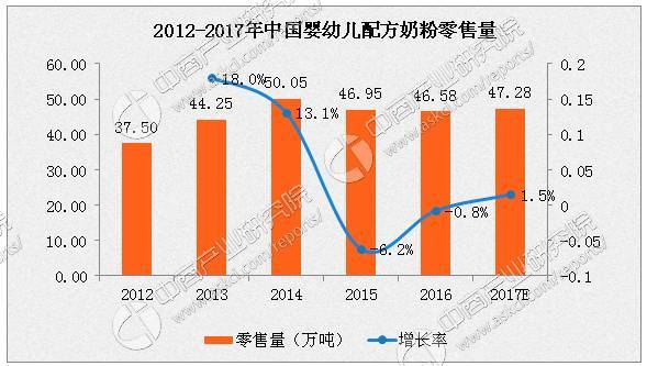 數(shù)據(jù)來源:中商產(chǎn)業(yè)研究院整理 中國的嬰幼兒配方奶粉零售量由2012年的37.5萬噸增至2016年的46.58萬噸,復(fù)合年增長率為5.6%。中國嬰幼兒配方奶粉市場零售量的增長趨勢與零售額相仿,而其復(fù)合年增長率較零售額為低,主要因高端產(chǎn)品的需求增加導(dǎo)致嬰幼兒配方奶粉產(chǎn)品的價格持續(xù)增長所致。在高端嬰幼兒配方奶粉市場的帶動下,估計中國嬰幼兒配方奶粉市場的零售量將從2016年的46.58萬噸以2.2%的復(fù)合年增長率增長,2017年預(yù)計達到47萬噸以上。