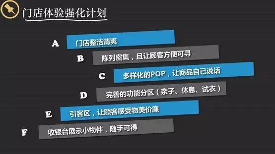 a.門(mén)店 整潔清爽;b.陳列密集,且讓顧客方便可尋;c.多樣化的POP,讓商品自己說(shuō)話(huà);d.完善的功能分區(qū)(親子,休息,試衣);e.引客區(qū),讓顧客感受物美價(jià)廉;f.收銀臺(tái)展示小物件,隨手可得。所謂精益管理,就是做好每個(gè)細(xì)節(jié)。 4、商圈用戶(hù)分析計(jì)劃 消費(fèi)者方面的兩個(gè)維度:一個(gè)是時(shí)間的維度,一天的時(shí)間,周一到周五,節(jié)假日;一個(gè)是空間的維度,核心的步行圈,公交圈、開(kāi)車(chē)圈,這些消費(fèi)者是不一樣的。