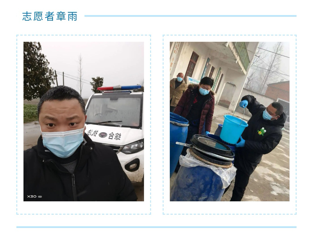 湖北疫情嚴重,也是中國“抗疫”的最前線,湖北勝則舉國勝!章雨先生是湖北省襄陽樊城太平店鎮小樊村人,軍人出身,2月8日,他領銜組建志愿者消毒隊,僅15分鐘就有21名志愿者報名,當日就完成了3000米主干道和10000多米次干道消毒工作。從2月8日上午至今,志愿者隊伍每天不間斷對大小村道和風險區域進行消毒,有組織地勸告村民不要串門,遵守紀律,少接觸、戴口罩、不聚餐、勤洗手。