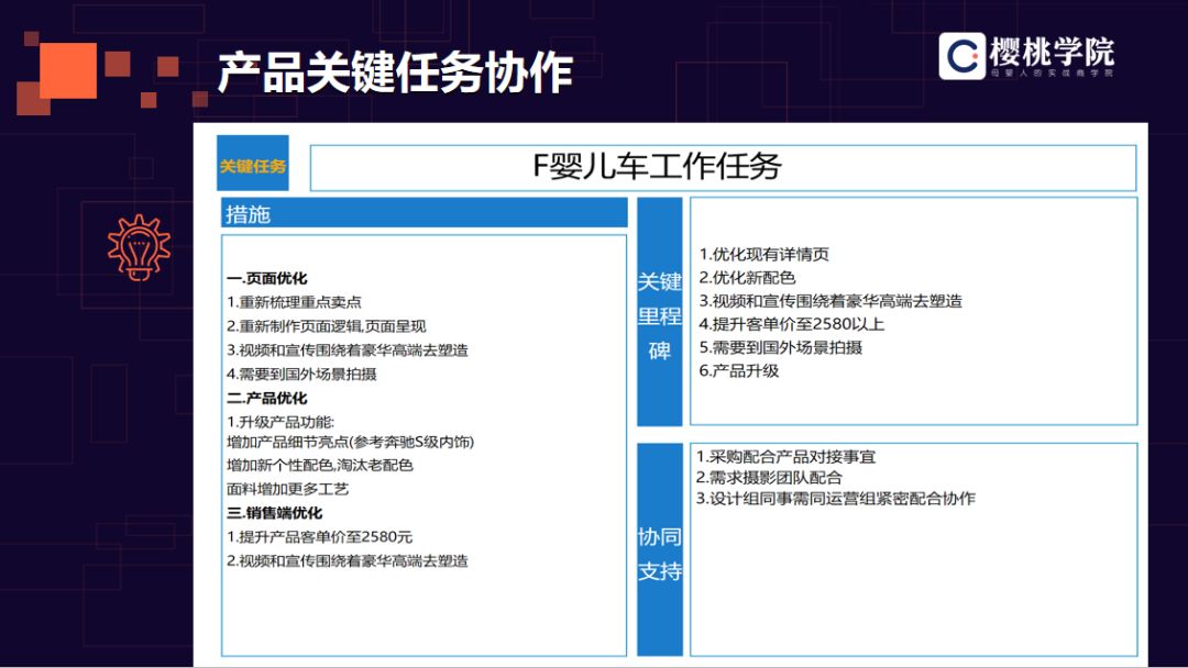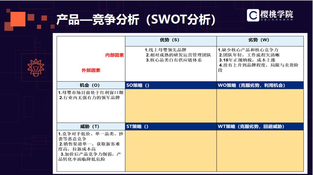 滲透力包括紙尿褲、嬰幼兒牛奶粉、睡袋、洗護用品等; 復購力包括嬰幼兒牛奶粉、嬰童褲子、套裝、運動鞋等; 價格力包括紙尿褲、濕巾、手推車等,很多品牌是依靠產(chǎn)品顏值提升價格力的。紙尿褲是一個廝殺比較厲害的品類,但是在2019年依然有品牌脫穎而出,例如babycare,它整體的顏值是比較高的,從而拉升了價格力,可以對比一下它的價格和店鋪,憑借顏值增加了產(chǎn)品的溢價能力; 延展力包括嬰童板鞋、孕婦褲中的直筒褲、孕產(chǎn)修復儀中的產(chǎn)后塑形等儀器,以及孕婦裝里的孕產(chǎn)婦鈴鐺。另外舉一下之前在可優(yōu)比做過的一個品類作為例證,就是防摔枕。防止寶寶學步時仰摔到頭部,這一產(chǎn)品解決了用戶的痛點,用戶自然會買單,這也是延展出來的一個產(chǎn)品。 1、根據(jù)GROW模型,打法沉淀 一是通過CRM,增加與該類人群的互動,持續(xù)召回老客,加強復購,老帶新裂變。購買頻次為核心驅動因子;利用其高頻購買忠誠度一特性,增強該策略人群與品牌的粘性。 二是廣泛吸引AI人群,站外種草,活動前預熱,促進該類人群對品牌首單購買。購買人數(shù)為核心驅動因子;利用其人群增量,提高品類在該人群中的滲透能力。 三是品類核心人群,通過單品類輻射到品牌其他品類,先做單品類的爆破和擊穿,然后再延伸到其他品類,提高客單的連帶率。 四是新品發(fā)售&單品組套發(fā)售目標人群,促進高客單轉化。核心驅動因子為頻次和客單價;利用新品吸引購買或者利用套裝增加策略人群的高客單購買。 2、GROW產(chǎn)品模型 如何落地 首先是戰(zhàn)略規(guī)劃能力。我們發(fā)現(xiàn),遇到戰(zhàn)略轉型,很多時候企業(yè)會選擇全做或全不做,很少進行針對性的側重和選擇。前者會導致企業(yè)的戰(zhàn)略資源被攤薄,執(zhí)行達不到效果;后者則會讓企業(yè)陷入溫水煮青蛙的境地。戰(zhàn)略其實就是做權衡,而 GROW 模型的目的正是協(xié)助企業(yè)更明智地做選擇。 其次是提升組織能力,包括商品開發(fā)、數(shù)字化營銷、大數(shù)據(jù)分析等 ,特別需要建立統(tǒng)一的數(shù)據(jù)中臺,整合各領域數(shù)據(jù),包括消費者分群信息、消費者線上及線下的購物車信息、消費者瀏覽行為信息、按品類的銷售信息、按促銷的銷售及利潤信息等。這樣才能為后端的品類開發(fā)和前端營銷部門提供明確的方向指導。 最后要改變傳統(tǒng)的工作方式,推行敏捷工作方法和鼓勵試錯的創(chuàng)新文化。敏捷不僅僅指速度效率的提升,更是真正以客戶為中心,快速滿足客戶的需求和反饋;打破部門墻,加強團隊協(xié)作;提升員工權限和主人翁意識。與數(shù)字原生企業(yè)相比,傳統(tǒng)消費品企業(yè)的文化厭惡風險,崇尚效率。然而互聯(lián)網(wǎng)平臺讓企業(yè)創(chuàng)新的成本大大降低,企業(yè)不妨將線上作為“嘗新”的測試平臺,鼓勵快速創(chuàng)新、快速失敗,并根據(jù)關鍵數(shù)據(jù)指標進行快速迭代試錯,最終打造出爆款產(chǎn)品。 更加嚴謹?shù)淖霎a(chǎn)品—競爭分析,就是SWOT分析,找到我們的優(yōu)勢和劣勢,我們的機會和威脅都有哪些,內(nèi)部和外部因素都有哪些。