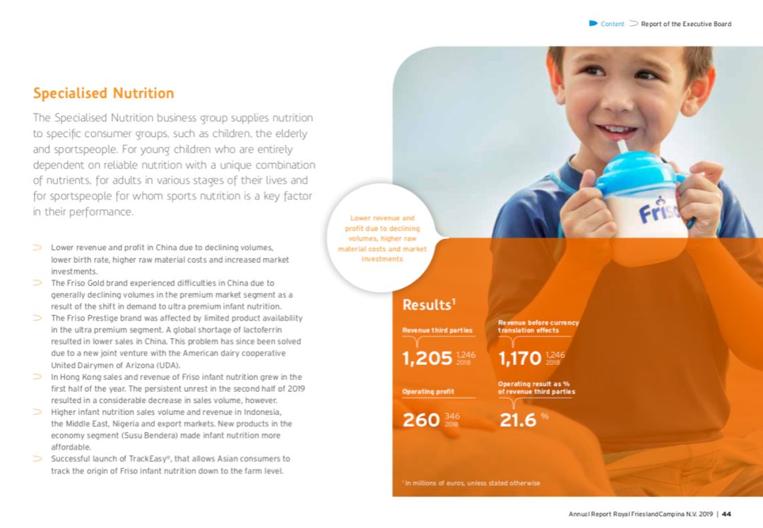 “在2019年,我們有意識地決定去更聚焦在品牌上。此外,通過引領可持續性和創新,我們正在設法提升我們的市場地位。同時,我們意識到,如果我們想最有效地利用業務領域中出現的機會,我們必須要變得更加果斷。”司馬翰在年報中說道。 他表示,為了實現這一目標,菲仕蘭正在采取下一步措施,這是2018年啟動的轉型計劃的后續行動,并且正在進一步調整業務部門的結構,以使其能夠快速、靈活地運作。 中國市場表現 小食代留意到,菲仕蘭在年報指出,2019年下半年,利潤較上半年略有下降,部分原因是中國香港地區發生的事件導致嬰兒營養品銷售下降。而在中國內地市場,由于較低的出生率,競爭的加劇(尤其是來自本土企業的競爭)以及乳鐵蛋白的短缺,也致使利潤有所下降。 另外,2019年,菲仕蘭在廣告和促銷上投入了5.6億歐元,比2018年增長了3.7%。“這主要是增加了在中國的投資,以及在我們的亞洲乳制品消費者品牌上的投資。”該公司表示。
