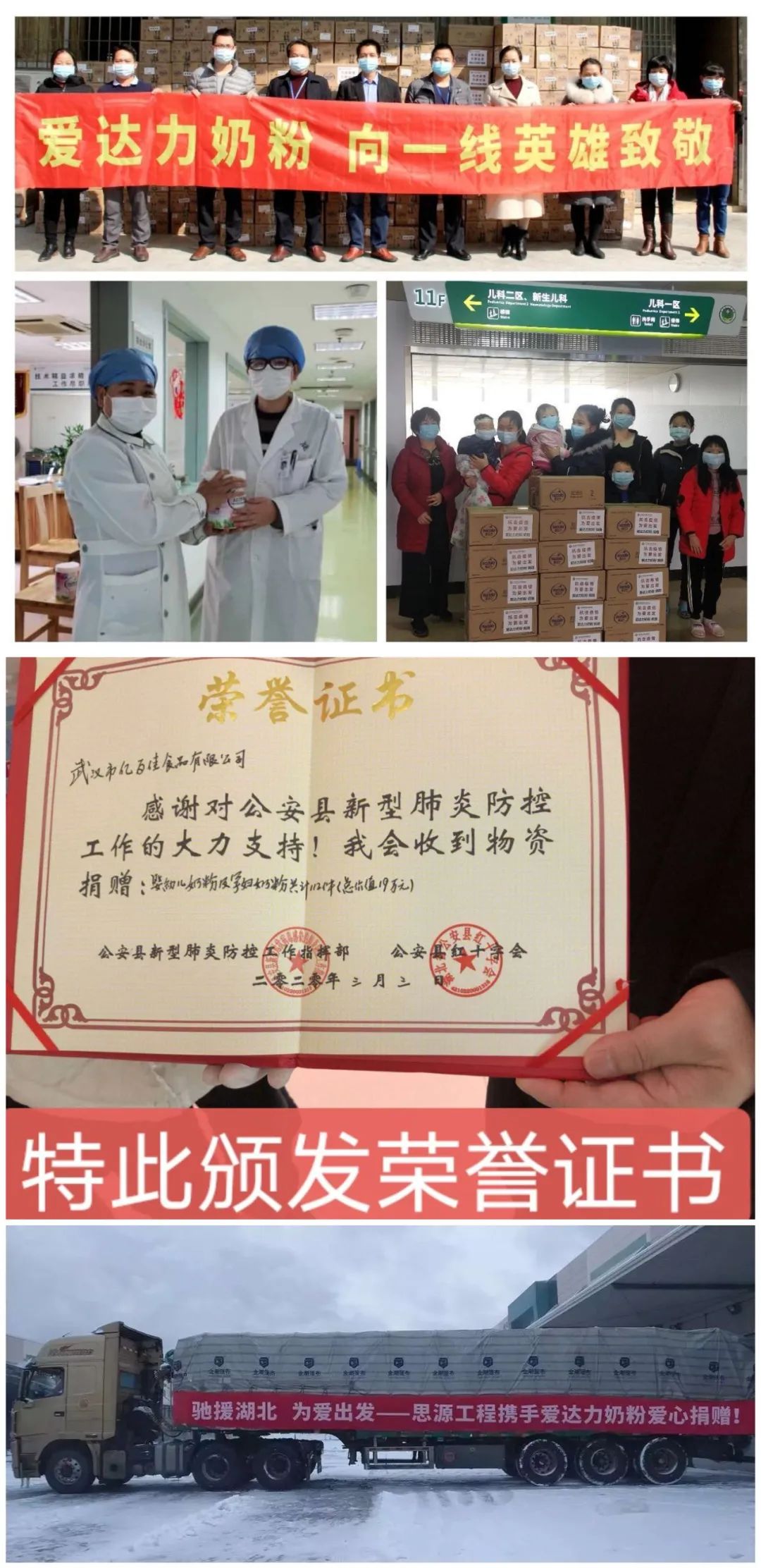 廣東億百公司,積極響應號召,疫情期間先后向湖北恩施福利院捐贈維愛佳奶粉1021罐,向湖北荊州慈善總會捐贈愛達力奶粉1356罐,向湖北公安縣紅十字會共計捐贈愛達力奶粉998罐,三批累計捐贈物資120多萬元。同時,向支援廣東、廣西、武漢、湖北黃岡、湖北隨州等多個地區,涉及醫院、學校、幼兒園及社區等多家機構,捐贈愛心物資超1500萬元。以及向武漢雷神山醫院,湖北省婦幼保健院,西安國際醫學中心醫院武漢醫療隊愛心捐贈營養配方奶粉、紐貝樂品牌乳鐵蛋白、口罩等物資,總價值達200萬元。