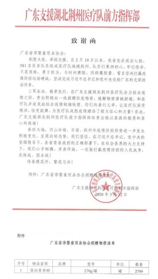 綠臣公司委托協會聯絡廣東支援湖北荊州醫療隊前方指揮部,把捐贈湯臣倍健2700罐蛋白粉送給醫護人員,在協會陳新華執行會長多方努力以及有關人士的幫助下,對接上廣東醫療隊指揮部成功把綠臣公司捐贈價值80萬物資成功發放給廣東一線醫護人員,增強醫護人員營養和免疫力起到很好的作用。近期收到指揮部致謝函!