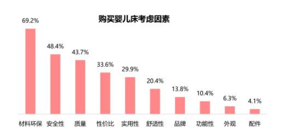 在購買嬰兒床方面,消費者則主要考慮材料環保、安全性和產品質量等因素。在環保材料選擇方面,無漆無味的環保木床深受歡迎;在實用性方面,可加長增寬的嬰兒床,以及滿足用戶需求的延展型兒童木床更有市場空間;在功能性方面,與成人床無縫拼接的兒童床、床中床和便捷床更受消費者喜愛。