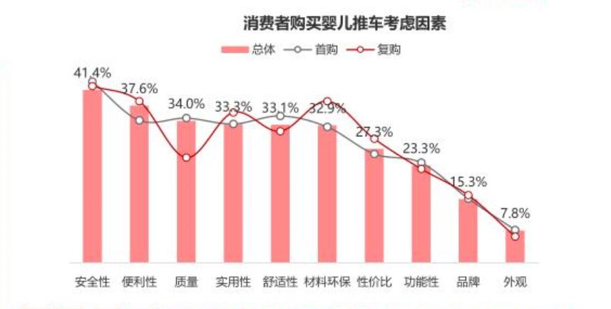 用戶群體以85后的年輕用戶為主,多集中在26-35歲之間,其中,未婚用戶比例更是占到40%。在城市分布方面,二四線城市用戶占比較高,分別占到30%和25%,而一線城市僅占20%。 針對男性用戶近半,未婚消費者居多的用戶畫像可得出,童車、童床品類產品的送禮屬性較強,品牌方在營銷過程中可以添加“送禮選購”等方面的策劃和宣傳。 消費者購買嬰兒推車更關注產品的安全性,購買嬰兒床主要關注材料環保等因素 通過大數據分析和車床類購買意愿調研發現,大多用戶會根據孩子的不同年齡段購買多輛童車。在這其中,首次購買嬰兒推車的消費者,其孩子的年齡大多在6個月以內,在產品購買方面較為注重安全性、推車產品質量以及減震舒適度。而隨著孩子成長、出行不斷增多,更多的復購用戶購買需求逐漸從“減震舒適”轉變為“輕巧便攜”,購買關鍵點則主要集中在便利性和實用性兩個方面。