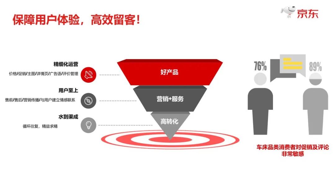 站內拉新,可以采用跨品類合作,首選與童車、童車關聯度較高的相關品類,比如嬰童用品、孕產、玩具、童書等,進行跨品類聯動。 站外拉新,則可通過社交電商、短視頻平臺、母嬰社區、社群營銷及線下俱樂部賽事合作等方式加強用戶滲透和拓展,最終達成對全渠道用戶的覆蓋。 大數據也顯示了客戶維護方面的關注重點:76%的車床品類消費者消費者對促銷比較敏感;89%的車床品類消費者則對評論非常敏感。根據這一數據反饋,從產品詳情介紹、促銷方案、價格范圍、廣告營銷、評論管理等方面著手,做好精細化運營,可以提升用戶體驗,實在高轉化和高效留客。 在私域粉絲運營方面,京東也給出了建議: 1. 需要針對專屬化、個性化的粉絲群體特色,搭建與之相符的各種營銷場景,迅速搶占購買用戶心智; 2. 通過各種促銷活動,以及優惠券的形式,加大與粉絲之間的互動,定向推廣符合其采購需求的強關聯產品; 3. 與此同時,采用店鋪直播X專業直播、貨品權益X全面預告、直播置頂X單品秒殺的直播形式,引導用戶進行加購。