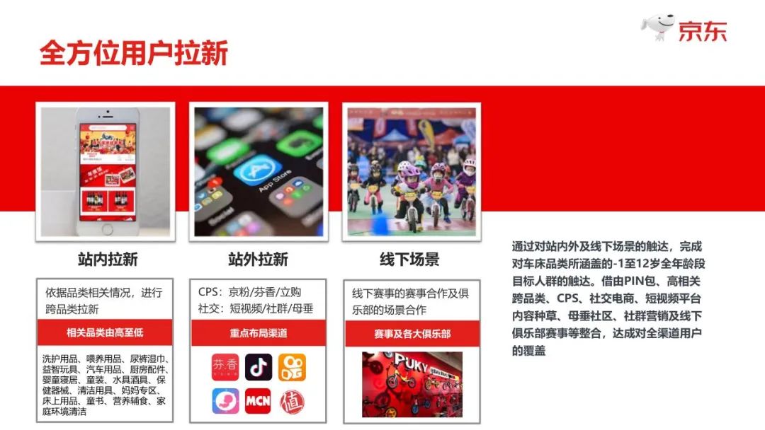 其中,暢銷的嬰兒推車均具備一鍵折疊、輕便易收納、便攜可登機等基礎屬性,暢銷顏色分別為黑、灰、紅三個系列。細分品類中,主流價位在600-800元之間、寬座在35cm以上的輕便型嬰兒推車;價位在1000-2000元之間、離地方面50cm以上的高景觀推車,以及價位在300元左右可換向的傘車較為暢銷。 同時,主流價位在700元以內的布藝折疊床中床、游戲床,以便攜和體積小等特色更受歡迎;此外,主流價位在500-1000元之間,具備四輪搖擺、音樂早教基礎功能的真車授權類兒童電動遙控車也深受市場歡迎。 童車童床營銷策略:跨品類聯動、對用戶評論精耕細作、私域粉絲針對性運營 隨著育兒需求和消費理念的不斷升級,對新生代父母的營銷更側重于個性化和專屬化。對于這部分人群而言,用戶拉新方式、注重用戶體驗、私域粉絲運營等方式是驅動購買力、提升銷售的“竅門”。 在拓展新用戶方面,主要可以通過站內觸達和站外觸達兩種方式: