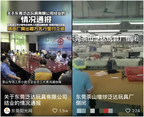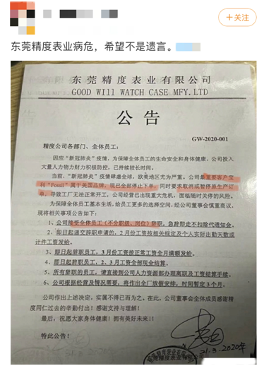 截圖源自抖音視頻 員工們感慨不已。“泛達是我們60、70年代人的作業地點和回憶……辛辛苦苦經營28載的事業,因為疫情而結業,真讓人痛心。”還有在泛達工作近13年的老員工在朋友圈感嘆,“公司陪伴我一起成長,共同見證了時代的變遷,公司創業28年,雖然也面對風雨飄搖,但這些年都挺過來了……” 可惜的是,這一次泛達玩具廠沒能挺過來。目前,東莞茶山人社分局專項工作小組已經協調解決結業后續事宜——在公司廠區內張貼欠薪逃匿公告,由廠房出租方先行墊付工資。 泛達玩具廠不是個例。3月21日,東莞精度表業有限公司在廠內發布公告稱,“當前,新冠肺炎疫情肆虐全球,歐美地區尤為嚴重。公司最重要客戶寶利‘Fossil’屬于美國品牌,現已全部停止下單,同時要求取消或暫停原生產訂單,導致工廠無法正常開工,公司已出現重大危機,面臨隨時關停的風險。”
