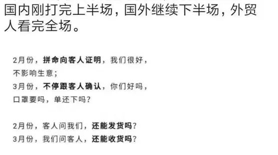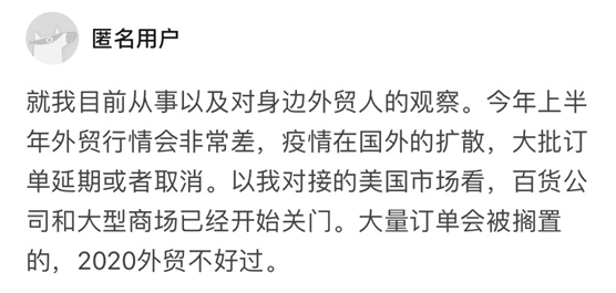 2020年春天,外貿行業生存不易。一位從業者在知乎上分享自己的觀察:今年上半年外貿行情會非常差,由于疫情在國外擴散,大批訂單延期或者取消。從對接的美國來看,百貨公司和大型商場都已經開始關門,大量訂單會被擱置。