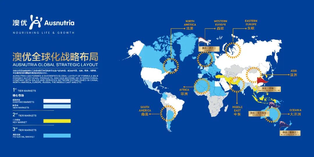市場競爭白熱化下,澳優緊跟市場變化,不斷優化佳貝艾特、海普諾凱、營養品品牌Nutrition Care等產品結構,也助力了澳優在競爭浪潮中的穩步發展。 加速全球化布局,持續發力全球供應鏈 2019年,國家七部委聯合發布了《國產嬰幼兒配方乳粉提升行動方案》,大力支持國產嬰幼兒配方乳粉“品質提升、產業升級、品牌培育”三大行動計劃。支持國內企業在境外收購和建設奶源基地,降低原料成本。鼓勵有實力、信譽好的企業在國外設立加工廠,并將生產的產品以自有品牌原裝進口。鼓勵國外乳粉企業在國內設立外商投資企業,促進中國品牌與外國品牌公平競爭,引入國外先進的生產技術及管理經驗,豐富國內產品供應。 國家鼓勵性政策的出臺不僅助推了澳優加速布局國際化,更彰顯了澳優超前發展的市場格局和思維。澳優在2003年成立之初,企業發展定位就是具有影響力的國際化乳企。為了更好走出國門,澳優在2011年開始正式布局海外。