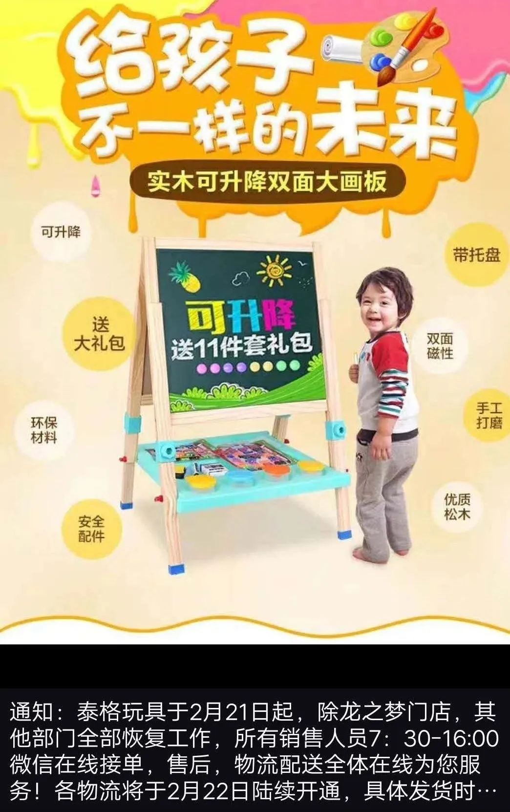 沈陽泰格兒童用品有限公司董事長 趙書偉女士 疫情期順勢推出兩大新舉措,讓產品庫存率增長幾乎0 新冠肺炎給玩具行業渠道和零售商普遍帶來較大影響,但趙董卻表示:“同比2019年,我們產品積壓沒有明顯變化,并沒有太大壓力。我們春節前的備貨,部分預期會消化得比較慢的產品,反而由于我們在疫情期所采取的新舉措、提供的新服務,而變得更好銷售。” 推出一鍵代發服務,讓零售門店激活社群輕松銷售 針對顧客無法到店選購消費的情況,作為代理商,泰格玩具為合作門店推出了一件代發服務,門店只需利用社群等推廣產品,收集顧客訂單提交即可。泰格玩具會從庫房安排快遞發貨,直接送到顧客手中。這種模式不占用門店面積、不用導購送貨,省時省力讓門店實現在線銷售。同時,針對需要囤貨的門店,泰格玩具還根據不同距離、不同進貨金額,推出免費送貨到店服務,解決零售門店的斷貨之憂。