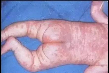 表現為皮膚潮紅,小斑丘疹上溢出淡黃色脂性液體覆蓋在皮疹上,以后結成較厚的黃色痂皮,不易除去,以頭頂及眉際、鼻旁、耳后多見,但是癢感不太明顯。